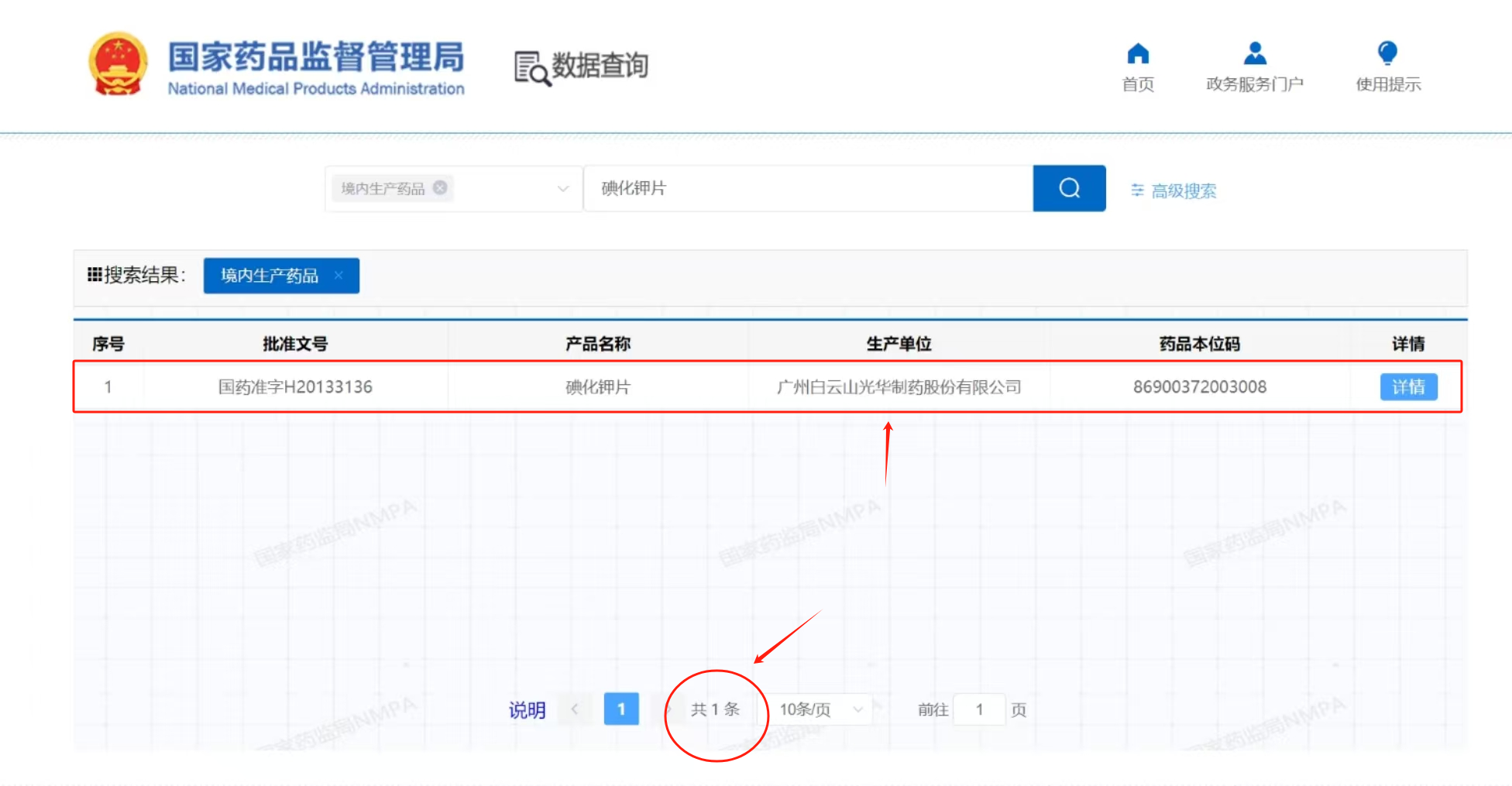 为做好核应急专用物资储备工作,保障核事故情况下应急工作人员与普通民众的身体健康,省核应急办需采购规格为130mg(含碘100mg)的碘化钾片。根据国家药品监督管理局官方网站查询结果(图1),此规格碘化钾片生产单位只有一家,即广州白云山光华制药股份有限公司。因此,本项目采用单一来源方式进行采购。