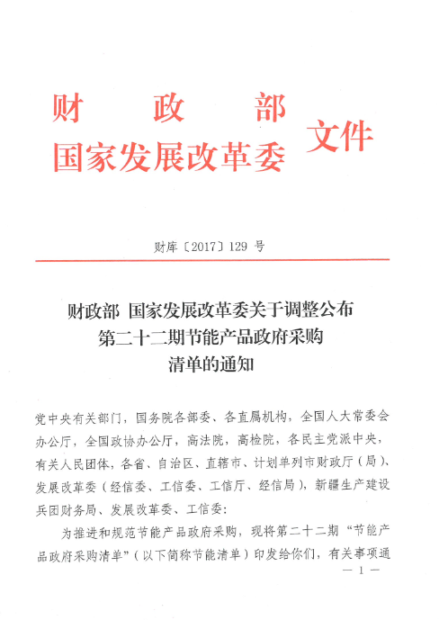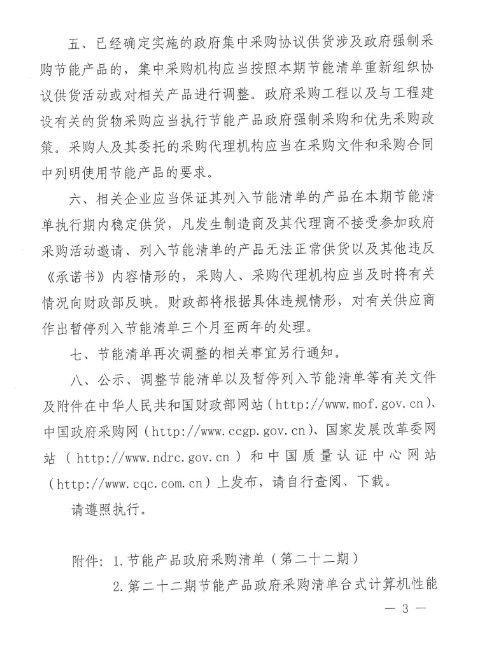 财政部 国家发展改革委关于调整公布第二十二期节能产品政府采购清单的通知