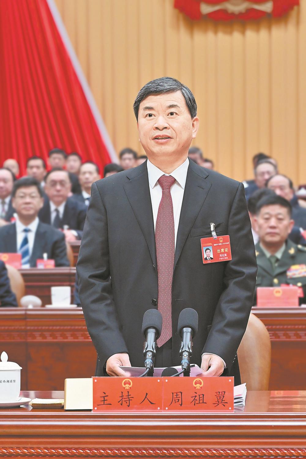 9时整,周祖翼宣布:省十四届人大三次会议开幕。全体起立,会场响起雄壮的国歌。