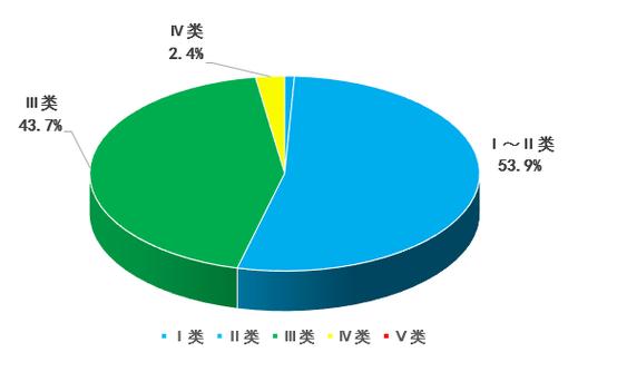 2022年1―7月,全省主要流域总体水质为优。监测的375个断面中,ⅰ~ⅲ类水质比例97.6%,其中ⅰ~ⅱ类水质比例53.9%。各类水质比例如下:ⅰ类占0.8%,ⅱ类占53.1%,ⅲ类占43.7%,ⅳ类占2.4%,无ⅴ类和劣ⅴ类水。小流域考核断面ⅰ~ⅲ类水质比例为93.0%。