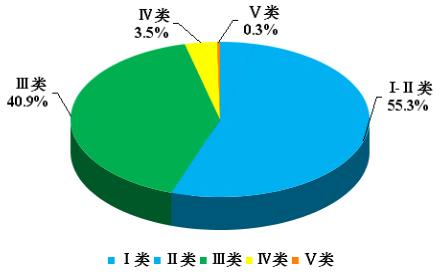 2023年1―4月,全省主要流域总体水质为优,ⅰ~ⅲ类水质比例96.3%,其中ⅰ~ⅱ类水质比例55.3%。各类水质比例如下:ⅰ类占3.7%,ⅱ类占51.6%,ⅲ类占40.9%,ⅳ类占3.5%,ⅴ类占0.3%,无劣ⅴ类。