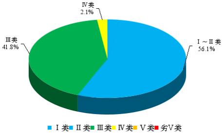 2023年1―5月,全省主要流域总体水质为优,国控断面ⅰ~ⅲ类水质比例97.1%,ⅰ~ⅱ类水质比例59.0%;省控以上断面ⅰ~ⅲ类水质比例97.9%,其中ⅰ~ⅱ类水质比例56.1%。各类水质比例如下:ⅰ类占2.4%,ⅱ类占53.7%,ⅲ类占41.8%,ⅳ类占2.1%,无ⅴ类和劣ⅴ类水。
