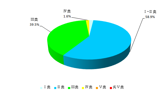 2023年1―7月,全省主要流域总体水质为优,国控断面ⅰ~ⅲ类水质比例98.1%,ⅰ~ⅱ类水质比例61.9%;省控以上断面ⅰ~ⅲ类水质比例98.4%,其中ⅰ~ⅱ类水质比例58.9%。各类水质比例如下:ⅰ类占1.9%,ⅱ类占57.0%,ⅲ类占39.5%,ⅳ类占1.6%,无ⅴ类和劣ⅴ类水。