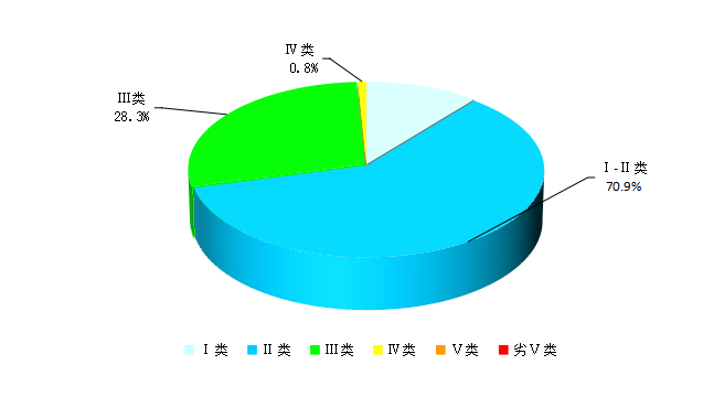 2024年1月,全省主要流域总体水质为优,国控断面ⅰ~ⅲ类水质比例98.1%,ⅰ~ⅱ类水质比例74.3%;国控及省控断面ⅰ~ⅲ类水质比例99.2%,其中ⅰ~ⅱ类水质比例70.9%,各类水质比例如下:ⅰ类占10.9%,ⅱ类占60.0%,ⅲ类占28.3%,ⅳ类占0.8%,无ⅴ类和劣ⅴ类水。