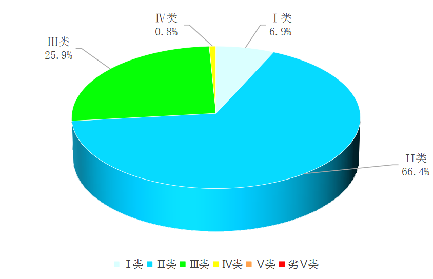 2025年1-4月,全省主要流域总体水质为优,国控断面ⅰ~ⅲ类水质比例100%,ⅰ~ⅱ类水质比例69.5%;国控及省控断面ⅰ~ⅲ类水质比例99.2%,其中ⅰ~ⅱ类水质比例73.3%,各类水质比例如下:ⅰ类占6.9%,ⅱ类占66.4%,ⅲ类占25.9%,ⅳ类占0.8%,无ⅴ类和劣ⅴ类水。