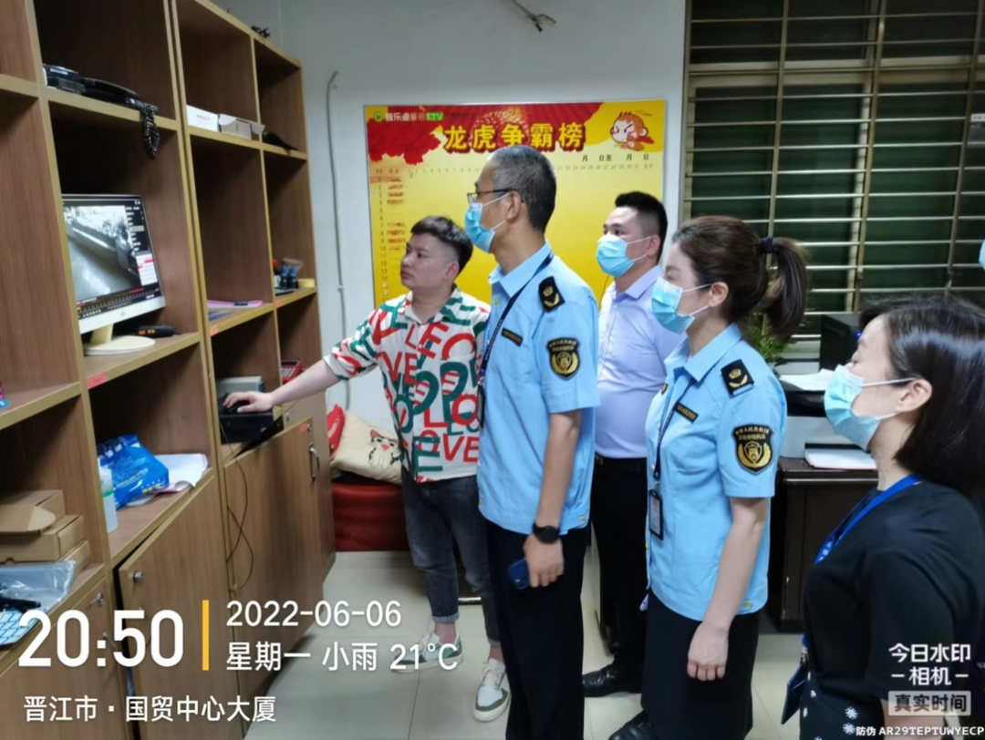 2022年6月6日20时50分,晋江市文化和旅游局执法人员检查辖区内青阳龙辉娱乐厅,出示证件亮明身份后抽查了2022年6月1日至5日该场所的监控视频,发现在6月3日凌晨02时45分还有客人在场所内消费,产生夜间噪声。