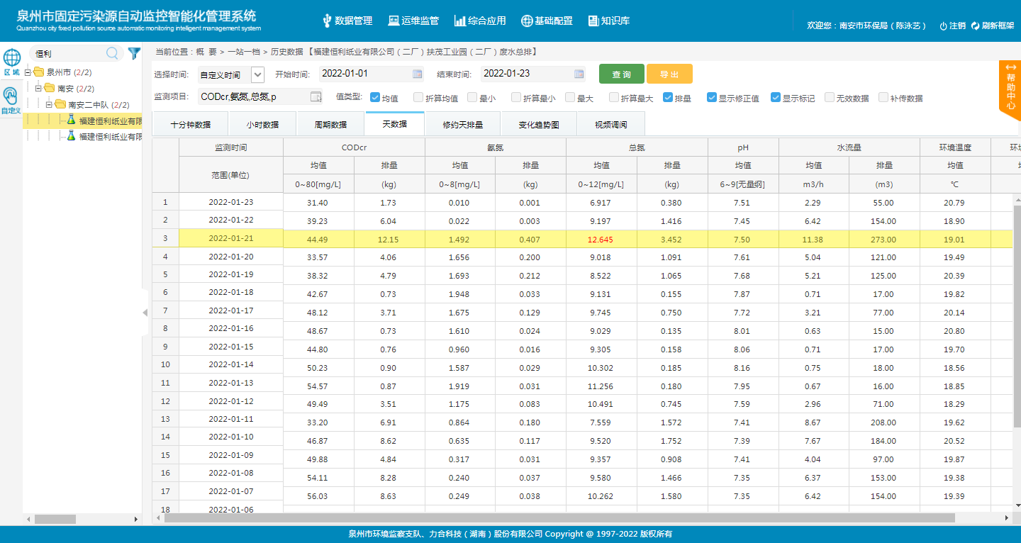 在线监控系统数据显示总氮监控数据日均值超标异常