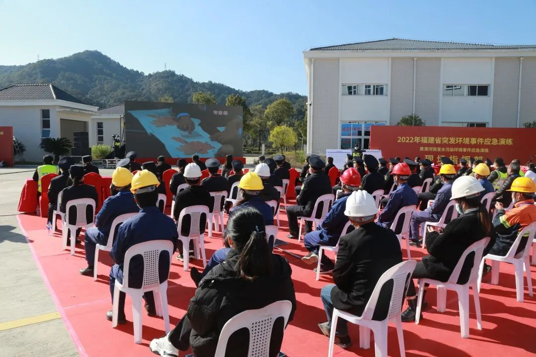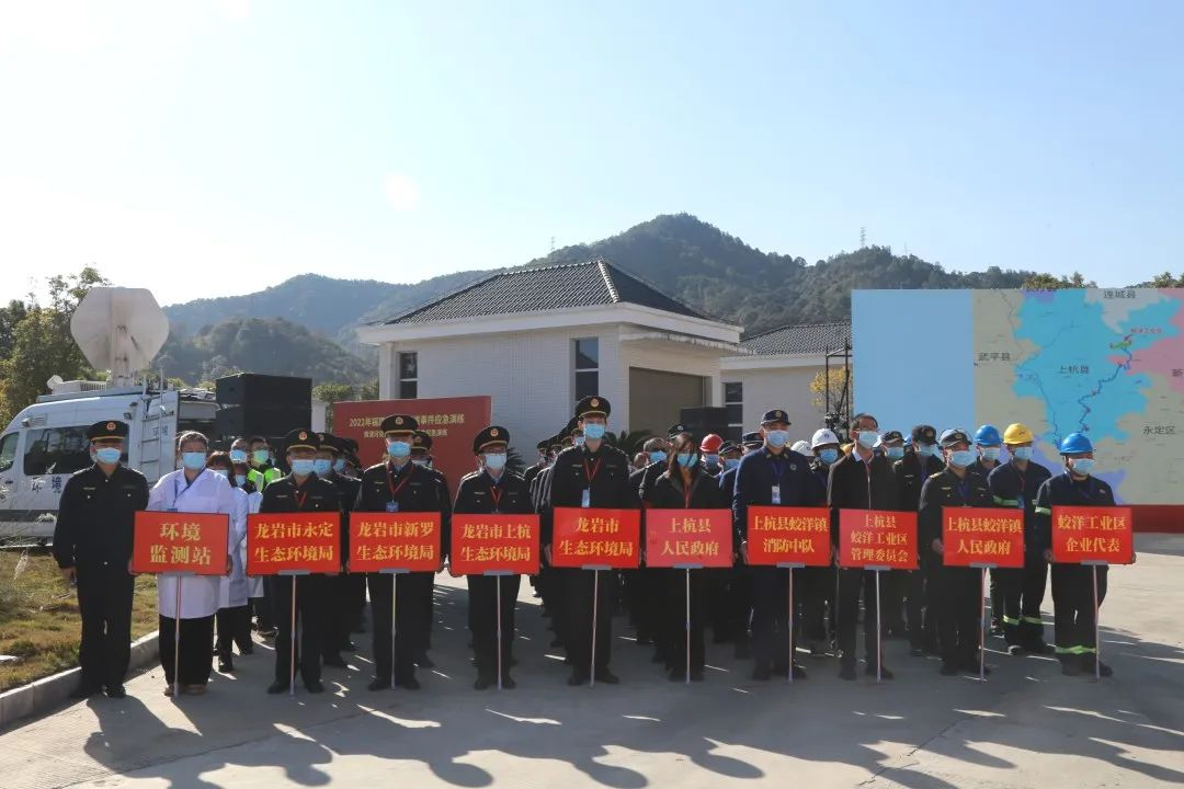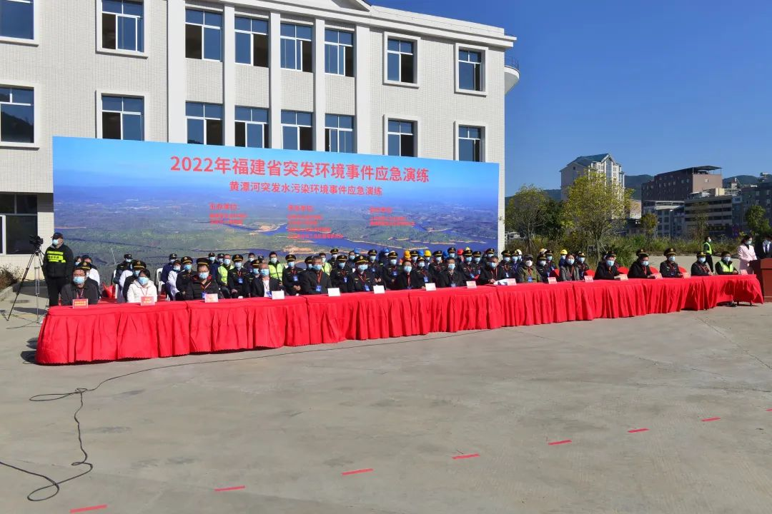 党的二十大报告指出:“必须牢固树立和践行绿水青山就是金山银山的理念,站在人与自然和谐共生的高度谋划发展。”“坚持安全第一、预防为主,建立大安全大应急框架,完善公共安全体系,推动公共安全治理模式向事前预防转型。”为深入贯彻落实党的二十大精神,有效提高福建省应对突发环境事件的应急反应能力和应急处置能力,切实保障环境安全。2022年12月21日,由福建省生态环境厅、龙岩市人民政府主办,龙岩市生态环境局、上杭县人民政府、龙岩市上杭生态环境局、上杭县蛟洋工业区管理委员会承办的2022年福建省突发环境事件应急演练在龙岩市上杭县蛟洋工业区举办。福建省生态环境厅、九市一区生态环境局通过线上直播的方式进行观摩,龙岩市生态环境局局长陈达兴、副局长刘玉梅,上杭县人民政府副县长卢永锋,省、市级环境应急专家、其他相关部门和工业区企业代表现场参加和观摩了本次演练。