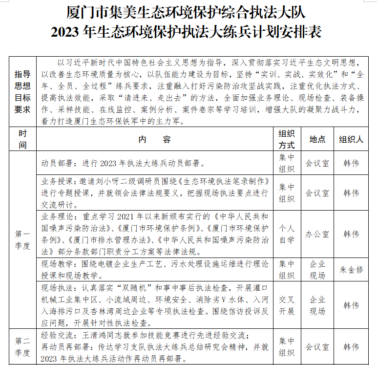 春风吹、战鼓擂。为深入贯彻落实习近平生态文明思想,集美生态环境保护综合执法大队,以改善生态环境质量为核心,以队伍能力建设为目标,坚持“实训、实战、实效化”和“全年、全员、全过程”练兵要求,注重融入打好污染防治攻坚战实践,认真传达支队执法大练兵总结研究会精神,进行再动员再部署,全面展开生态环境执法大练兵活动,努力打造厦门生态环保铁军中的主力军。