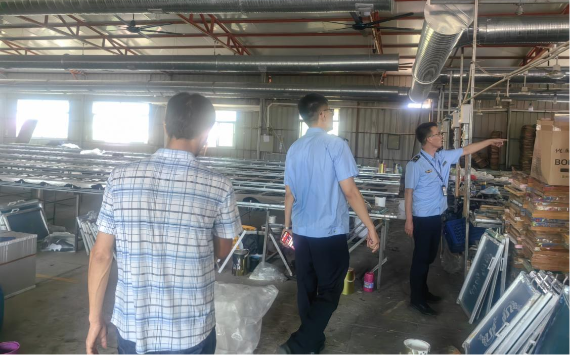 图为执法人员现场检查泉州洛江好利来鞋业有限公司洗版区域