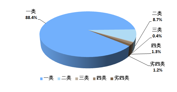 2023年夏季,本时段全省近岸海域监测的142个国控点位,按照面积法评价,优良(一、二类)水质比例97.1%,同比上升0.2个百分点。各类水质比例如下:一类占88.4%,二类占8.7%,三类占0.4%,四类占1.3%,劣四类占1.2%。