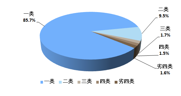 2023年春夏季我省共开展两次监测,累计情况为:全省近岸海域监测的142个国控点位,按照面积法评价,优良(一、二类)水质比例为95.2%。各类水质比例如下:一类占85.7%,二类占9.5%,三类占1.7%,四类占1.5%,劣四类占1.6%。