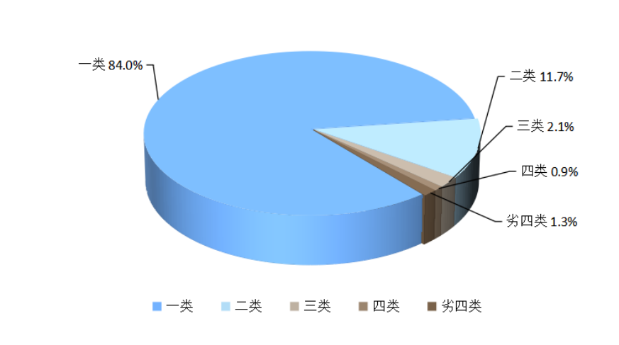 2024年春夏季,全省近岸海域水质状况如下:按照面积法评价,国控点位优良(一、二类)水质比例95.7%,各类水质比例如下:一类占84.0%,二类占11.7%,三类占2.1%,四类占0.9%,劣四类占1.3%;国省控点位优良(一、二类)水质比例为95.3%。按照点位法评价,国控点位优良(一、二类)水质比例87.3%,国省控点位优良(一、二类)水质比例为84.3%。