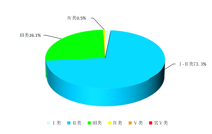 2024年1―8月,全省主要流域总体水质为优,国控断面ⅰ~ⅲ类水质比例100%,ⅰ~ⅱ类水质比例74.3%;国控及省控断面ⅰ~ⅲ类水质比例99.5%,其中ⅰ~ⅱ类水质比例73.3%,各类水质比例如下:ⅰ类占1.6%,ⅱ类占71.7%,ⅲ类占26.1%,ⅳ类占0.5%,无ⅴ类和劣ⅴ类水。