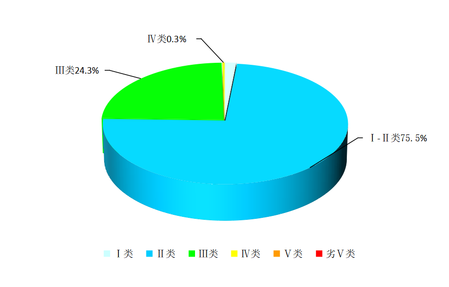 2024年1―9月,全省主要流域总体水质为优,国控断面ⅰ~ⅲ类水质比例100%,ⅰ~ⅱ类水质比例74.3%;国控及省控断面ⅰ~ⅲ类水质比例99.7%,其中ⅰ~ⅱ类水质比例75.5%,各类水质比例如下:ⅰ类占1.6%,ⅱ类占73.9%,ⅲ类占24.3%,ⅳ类占0.3%,无ⅴ类和劣ⅴ类水。
