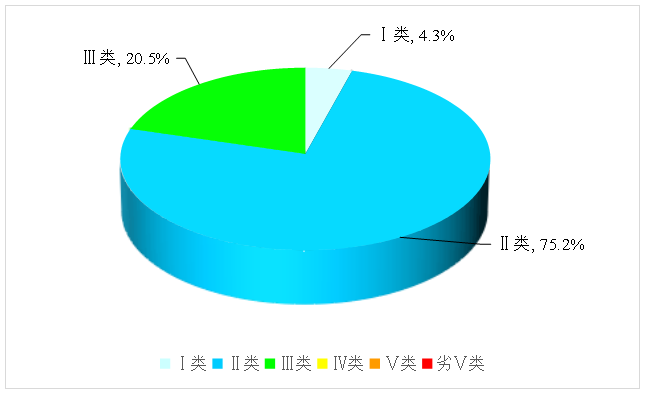2025年1-9月,全省主要流域总体水质为优,国控断面ⅰ~ⅲ类水质比例100%,ⅰ~ⅱ类水质比例78.1%;国控及省控断面ⅰ~ⅲ类水质比例100%,其中ⅰ~ⅱ类水质比例79.5%,各类水质比例如下:ⅰ类占4.3%,ⅱ类占75.2%,ⅲ类占20.5%,无ⅳ类、ⅴ类水和劣ⅴ类水。