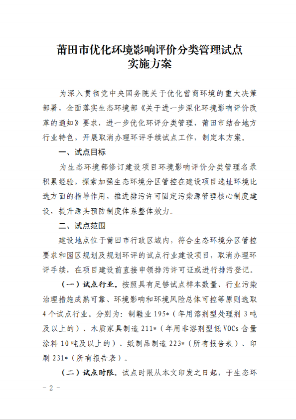 为进一步推动环评审批制度改革,积极响应生态环境部《关于进一步深化环境影响评价改革的通知》文件精神,莆田市于2025年2月21日印发实施《莆田市优化环境影响评价分类管理试点实施方案》,选取制鞋、木质家具制造、纸制品制造和印刷4个行业试点取消办理环评手续,通过制定行业准入指引、明晰办理流程、简化总量管理和强化事中事后监管等举措,探索生态环境分区管控选址环境比选、环评与排污许可制度的深度融合路径。