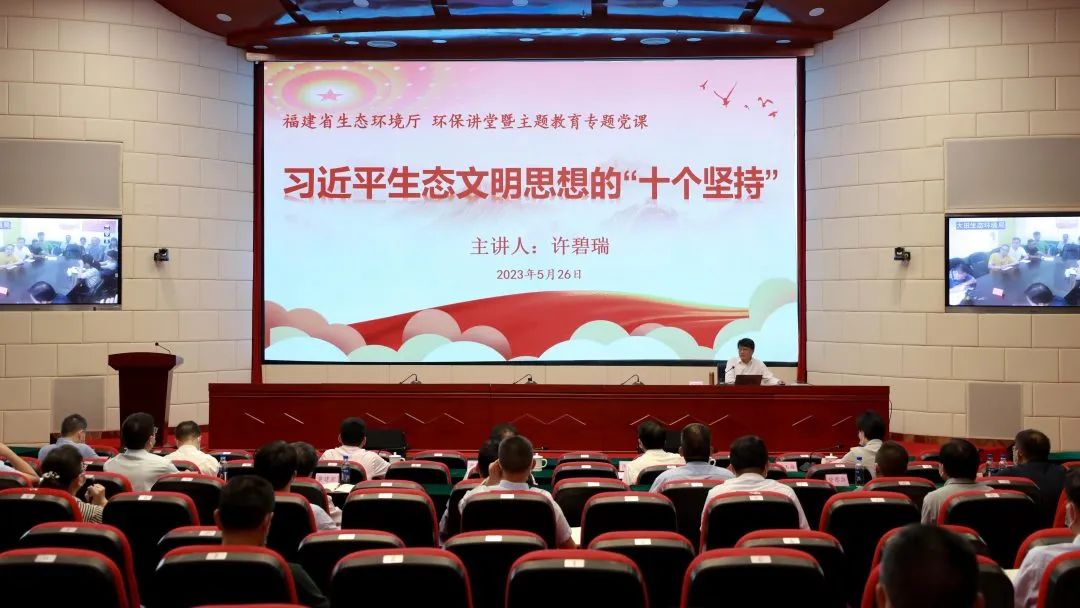 当天下午,厅党组书记、厅长许碧瑞为全省生态环境系统党员干部职工上《习近平生态文明思想的“十个坚持”》专题党课。省委主题教育第12巡回指导组组长严金静、副组长赵明,厅领导,厅机关各处室党员干部在主会场参加,直属各单位、各设区市生态环境局和平潭综合实验区自然资源与生态环境局全体党员干部以视频方式在分会场参加。