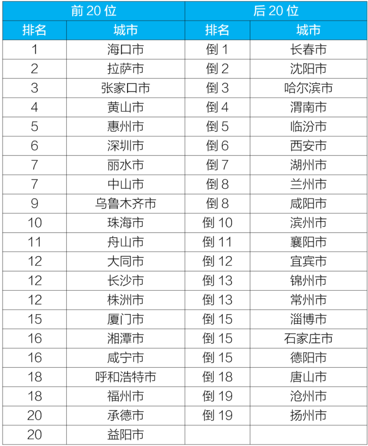 4月,168个重点城市中,海口、拉萨和张家口等城市空气质量相对较好(从第1名至并列第20名);长春、沈阳和哈尔滨等城市空气质量相对较差(从倒数第1名至并列倒数第19名)。见附表1。
