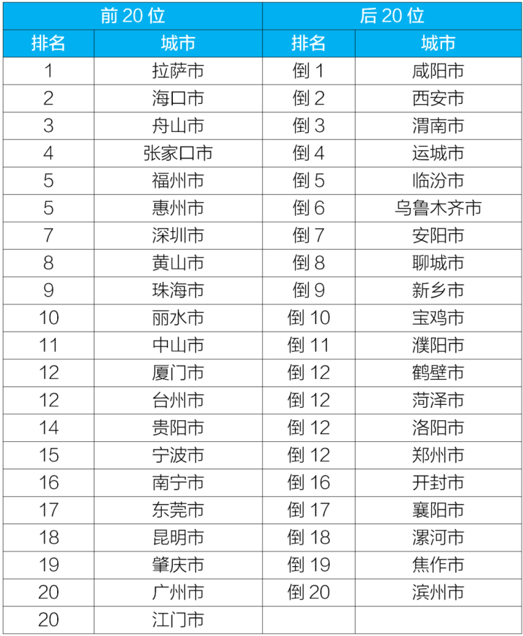 1—4月,168个重点城市中,拉萨、海口和舟山等城市空气质量相对较好(从第1名至并列第20名);咸阳、西安和渭南等城市空气质量相对较差(从倒数第1名至倒数第20名)。见附表2。