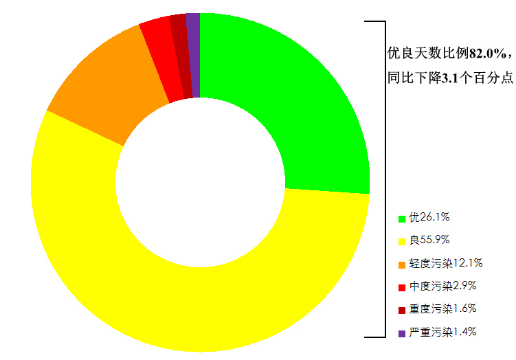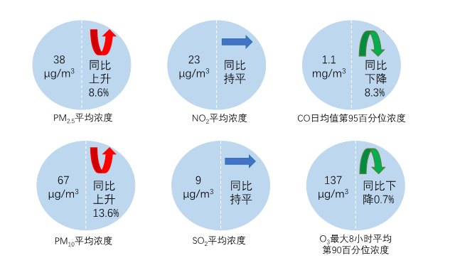 1—5月,全国339个地级及以上城市平均空气质量优良天数比例为82.0%,同比下降3.1个百分点;平均重度及以上污染天数比例为3.0%,同比上升1.6个百分点;pm2.5平均浓度为38微克/立方米,同比上升8.6%;pm10平均浓度为67微克/立方米,同比上升13.6%;o3平均浓度为137微克/立方米,同比下降0.7%;so2平均浓度为9微克/立方米,同比持平;no2平均浓度为23微克/立方米,同比持平;co平均浓度为1.1毫克/立方米,同比下降8.3%。