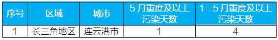 5月重点区域出现重度及以上污染天的城市及具体天数详见附表3。