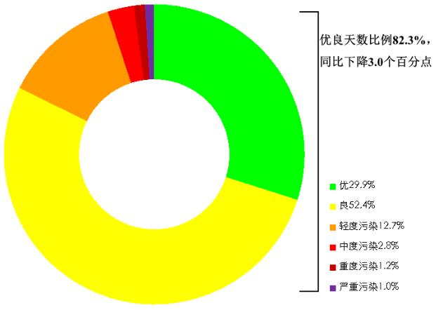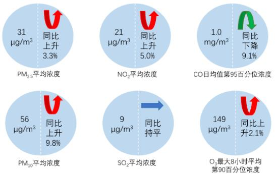 1—7月,全国339个地级及以上城市平均空气质量优良天数比例为82.3%,同比下降3.0个百分点;平均重度及以上污染天数比例为2.2%,同比上升1.1个百分点;pm2.5平均浓度为31微克/立方米,同比上升3.3%;pm10平均浓度为56微克/立方米,同比上升9.8%;o3平均浓度为149微克/立方米,同比上升2.1%;so2平均浓度为9微克/立方米,同比持平;no2平均浓度为21微克/立方米,同比上升5.0%;co平均浓度为1.0毫克/立方米,同比下降9.1%。