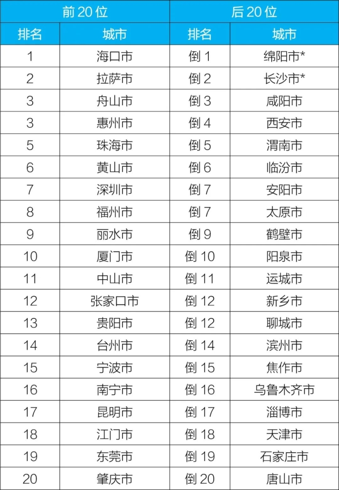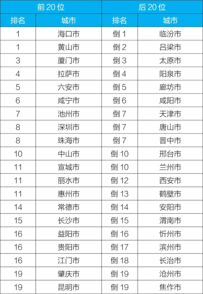 7月,168个重点城市中,空气质量排名前20位城市依次是海口、黄山和厦门等城市(从第1名至并列第19名);空气质量排名后20位城市依次是临汾、吕梁和太原等城市(从倒数第1名至并列倒数第19名)。见附表1。