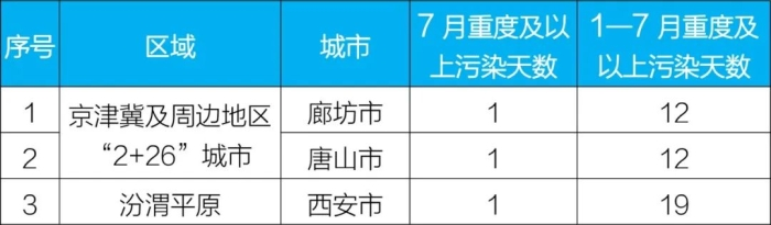 7月和1—7月重点区域出现重度及以上污染天的城市及具体天数详见附表3。