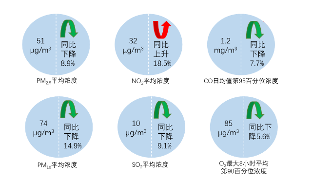 1月,全国339个地级及以上城市平均空气质量优良天数比例为78.5%,同比上升4.2个百分点;平均重度及以上污染天数比例为2.2%,同比下降3.2个百分点;pm2.5平均浓度为51微克/立方米,同比下降8.9%;o3平均浓度为85微克/立方米,同比下降5.6%;pm10平均浓度为74微克/立方米,同比下降14.9%;so2平均浓度为10微克/立方米,同比下降9.1%;no2平均浓度为32微克/立方米,同比上升18.5%;co平均浓度为1.2毫克/立方米,同比下降7.7%。
