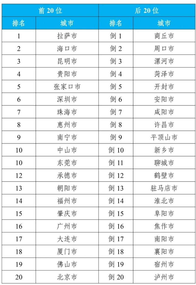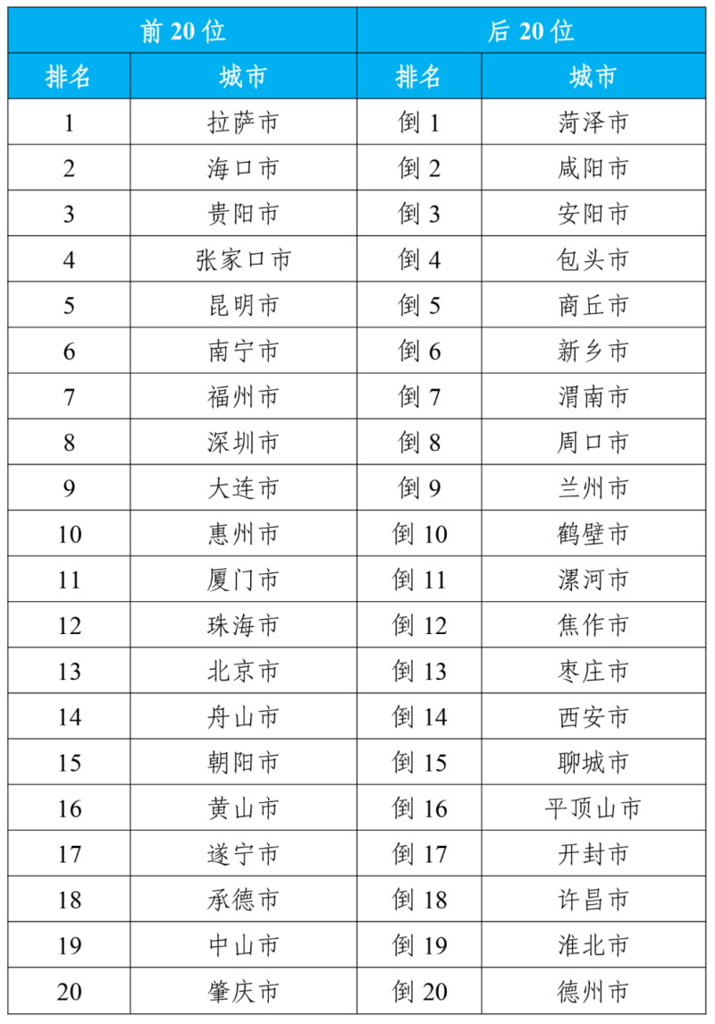 1月,168个重点城市中:空气质量排名前20位城市依次是拉萨、海口和贵阳等城市(从第1名至第20名);空气质量排名后20位城市依次是菏泽、咸阳和安阳等城市(从倒数第1名至倒数第20名)。详见附表1。