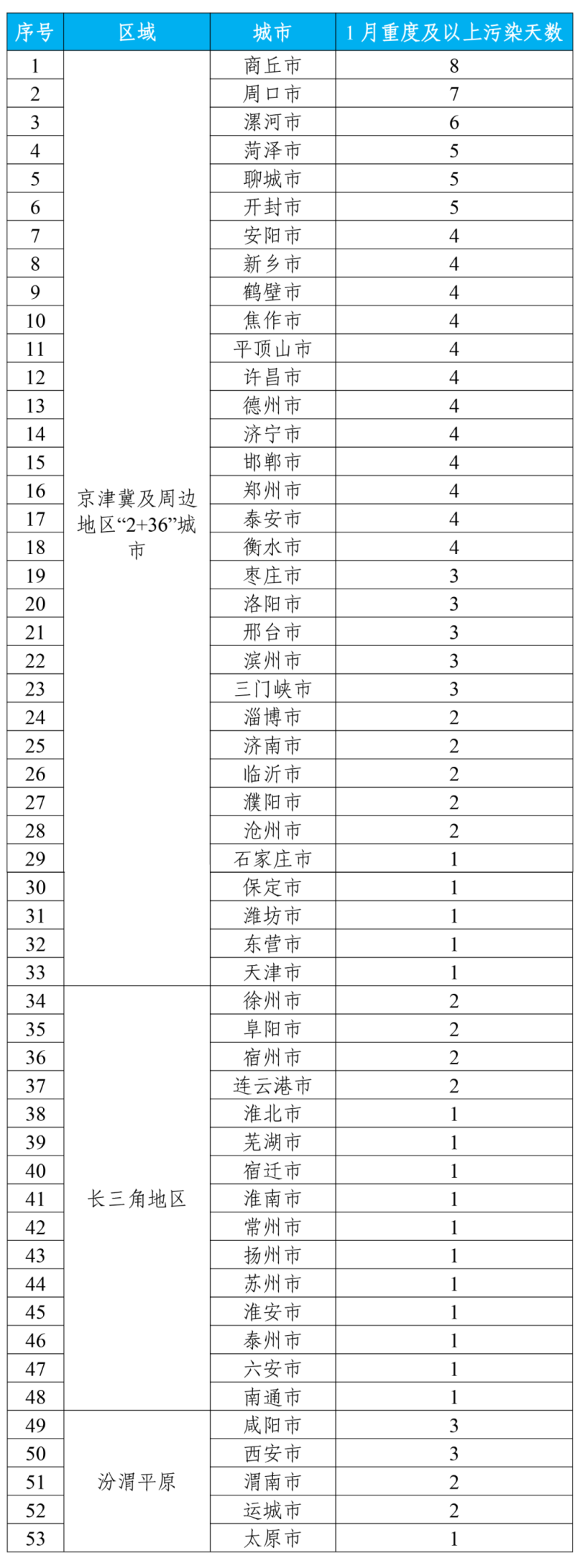 1月重点区域出现重度及以上污染天的城市及具体天数详见附表3。