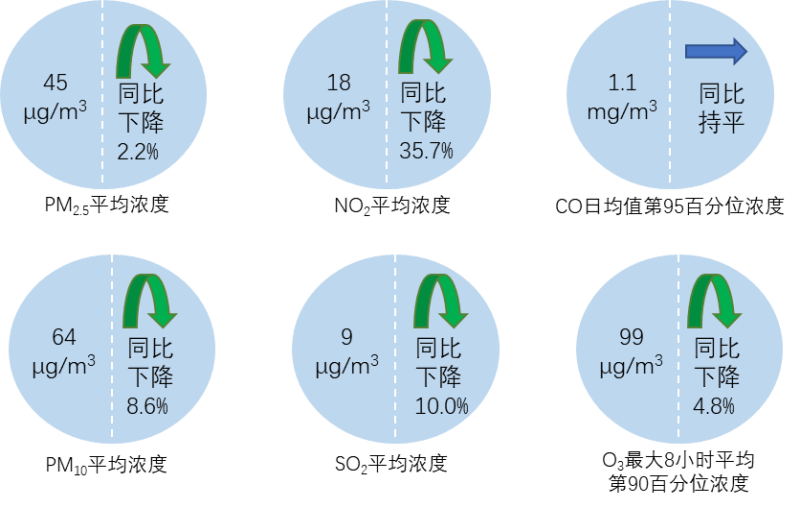 2月,全国339个地级及以上城市pm2.5平均浓度为45微克/立方米,同比下降2.2%;o3平均浓度为99微克/立方米,同比下降4.8%;pm10平均浓度为64微克/立方米,同比下降8.6%;so2平均浓度为9微克/立方米,同比下降10.0%;no2平均浓度为18微克/立方米,同比下降35.7%;co平均浓度为1.1毫克/立方米,同比持平。