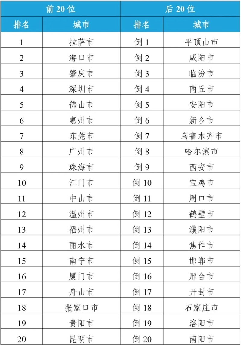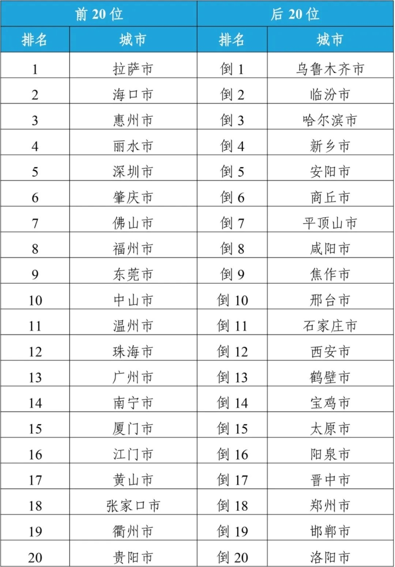 2月,168个重点城市中:空气质量排名前20位城市依次是拉萨、海口、惠州等城市(从第1名至第20名);空气质量排名后20位城市依次是乌鲁木齐、临汾、哈尔滨等城市(从倒数第1名至倒数第20名)。见附表1。
