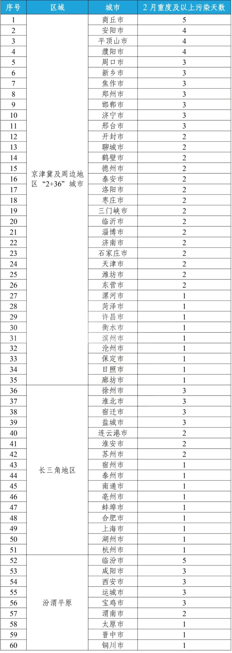 2月重点区域出现重度及以上污染天的城市及具体天数见附表3。