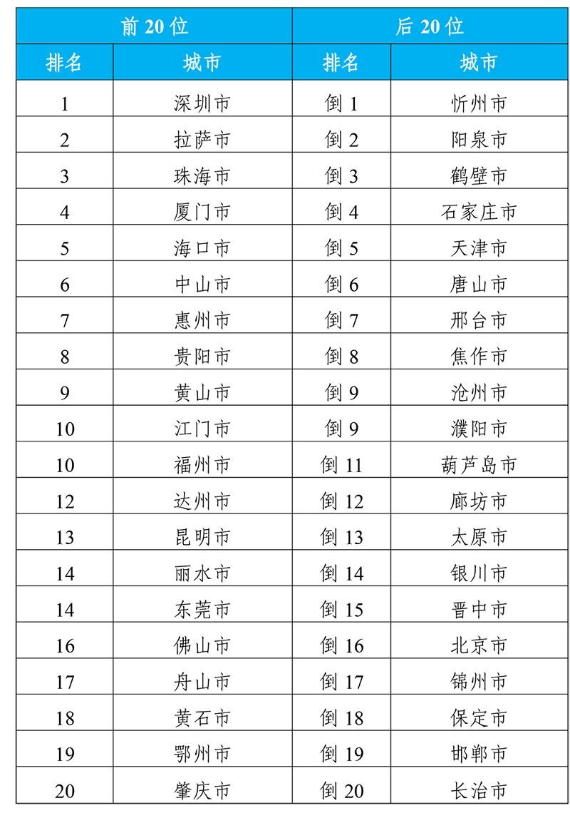 7月,168个重点城市中:pm2.5浓度排名前20位城市依次是深圳、拉萨、珠海等城市(从第1名至第20名);pm2.5浓度排名后20位城市依次是忻州、阳泉、鹤壁等城市(从倒数第1名至倒数第20名)。见附表2。