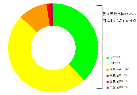 1—12月,全国339个地级及以上城市平均空气质量优良天数比例为87.2%,同比上升1.7个百分点;平均重度及以上污染天数比例为0.9%,同比下降0.7个百分点。由沙尘天气导致的平均超标天数比例为1.9%,其中重度及以上污染天数比例为0.4%。