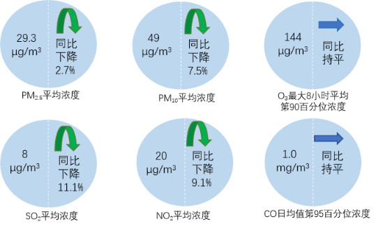 1—12月,全国339个地级及以上城市pm2.5平均浓度为29.3微克/立方米,同比下降2.7%;pm10平均浓度为49微克/立方米,同比下降7.5%;o3平均浓度为144微克/立方米,同比持平;so2平均浓度为8微克/立方米,同比下降11.1%;no2平均浓度为20微克/立方米,同比下降9.1%;co平均浓度为1.0毫克/立方米,同比持平。