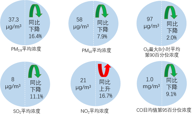 2月,全国339个地级及以上城市pm2.5平均浓度为37.3微克/立方米,同比下降16.4%;pm10平均浓度为58微克/立方米,同比下降7.9%;o3平均浓度为97微克/立方米,同比下降2.0%;so2平均浓度为8微克/立方米,同比下降11.1%;no2平均浓度为21微克/立方米,同比上升16.7%;co平均浓度为1.0毫克/立方米,同比下降9.1%。