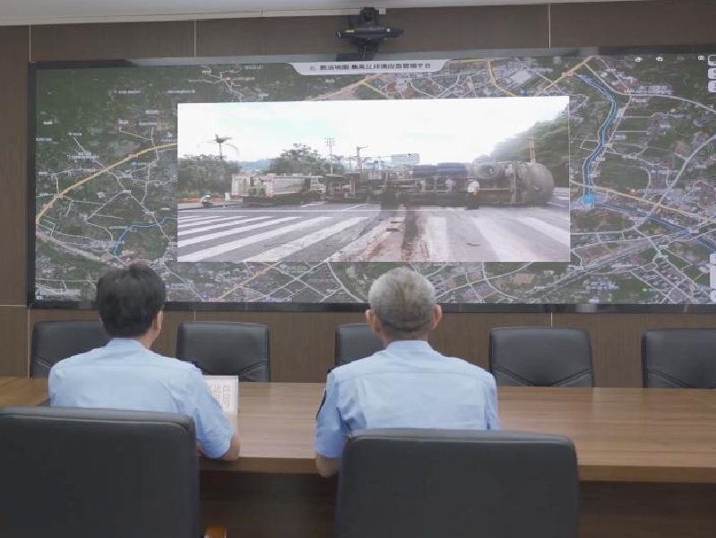 图为生态环境部门后方值守组依托数字地图平台指挥调度。