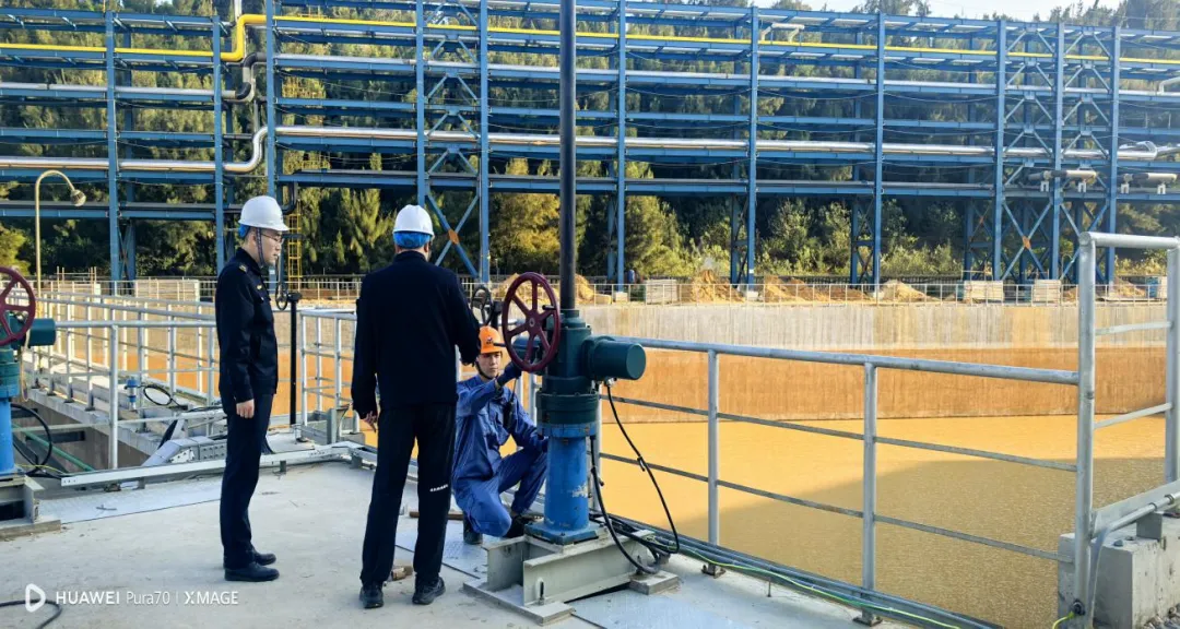 企业员工正在切换事故应急池阀门