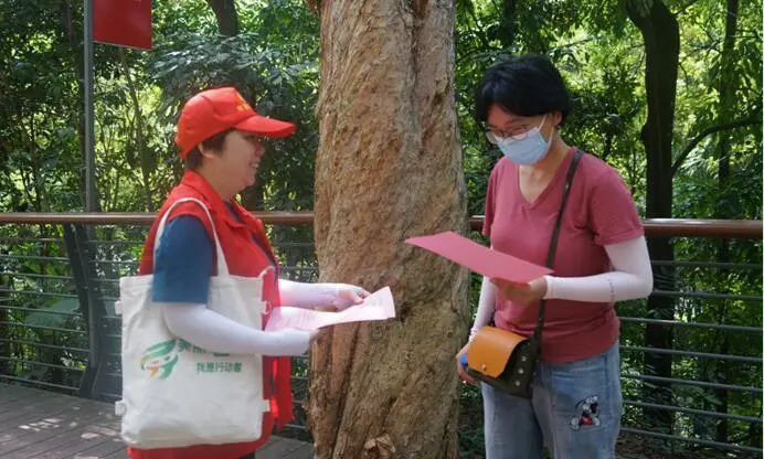 另一组成员身着志愿者服装,为园内的游客发放“中国公民国内旅游文明行为公约”传单及“公民生态环境行为规范(试行)”手册,宣传“保护自然人人有责”的环保意识,号召大家从自身做起,做低碳生活的引领者、宣传者、推动者。