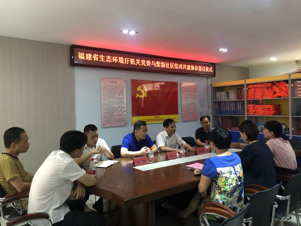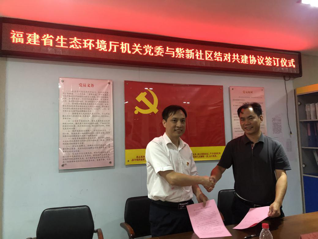 为全力支持新时代文明实践中心建设,进一步推动习近平新时代中国特色社会主义思想深入人心、落地生根,2020年9月18日上午,省生态环境厅机关党委与晋安区紫新社区新时代文明实践站联合举行结对共建协议签订仪式。省生态环境厅机关党委李荣寿专职副书记、福州市晋安生态环境局谢少俊局长、晋安区王庄街道党委叶飞彬书记参加了签订仪式。