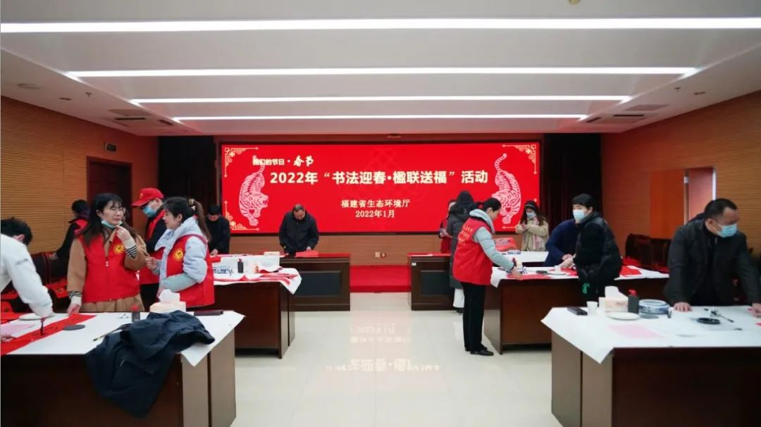 2022年1月21日,省生态环境厅举办“我们的节日•春节”2022年“书法迎春•楹联送福”活动,展示中华民族传统文化魅力,营造吉祥、欢庆、和谐的节日氛围。活动邀请了福建海峡生态书画院的书法名家与省生态环境厅机关、直属单位在职及离退休干部职工中的书法爱好者一同浓墨御福,妙笔迎春。