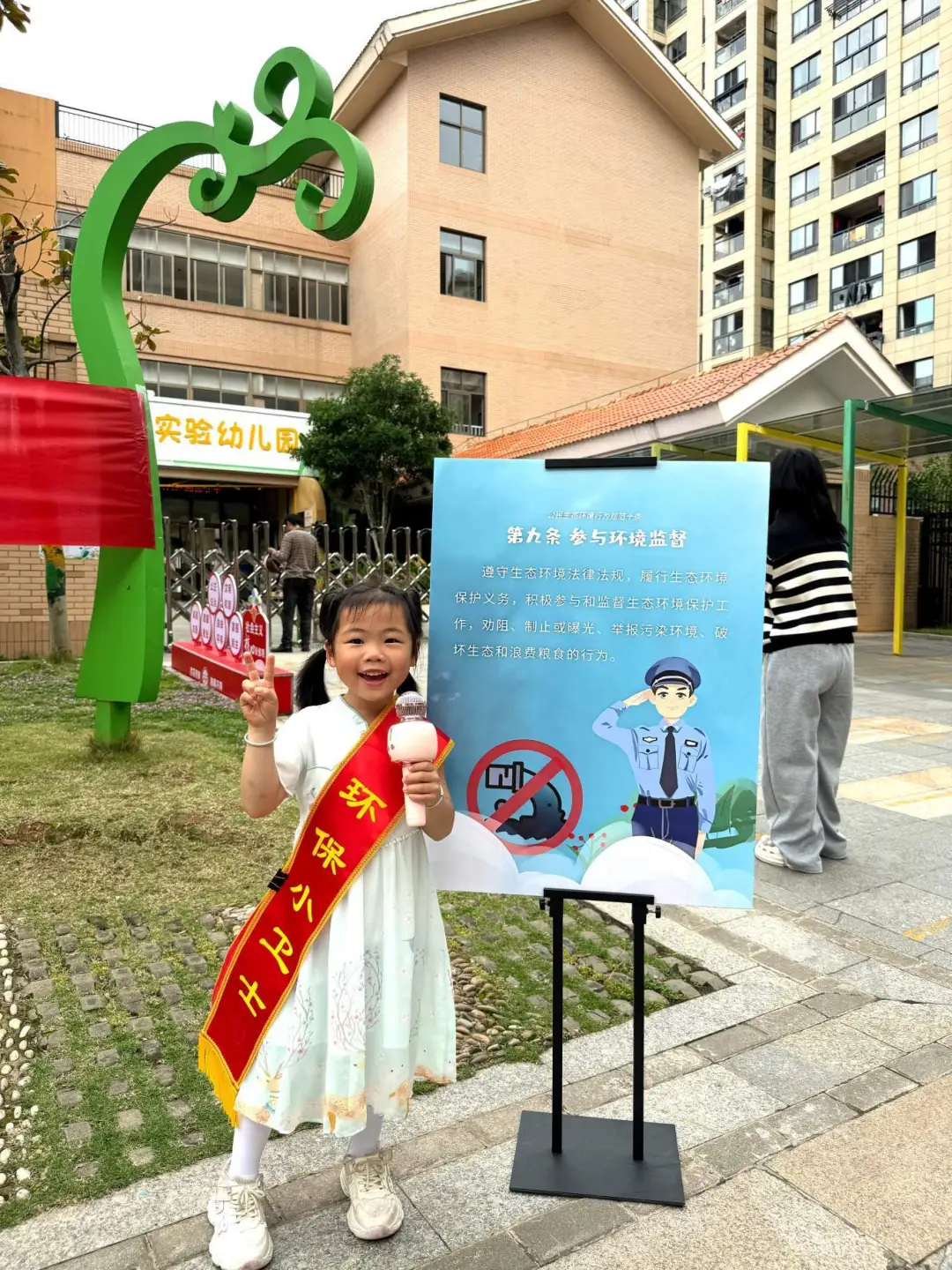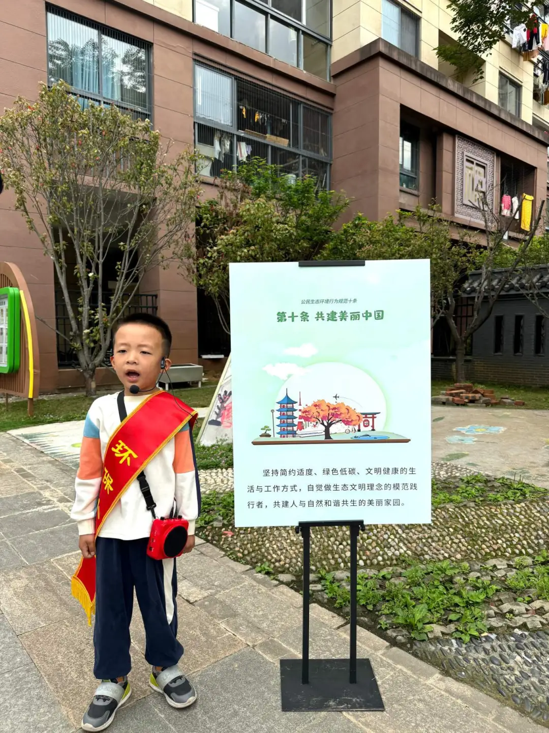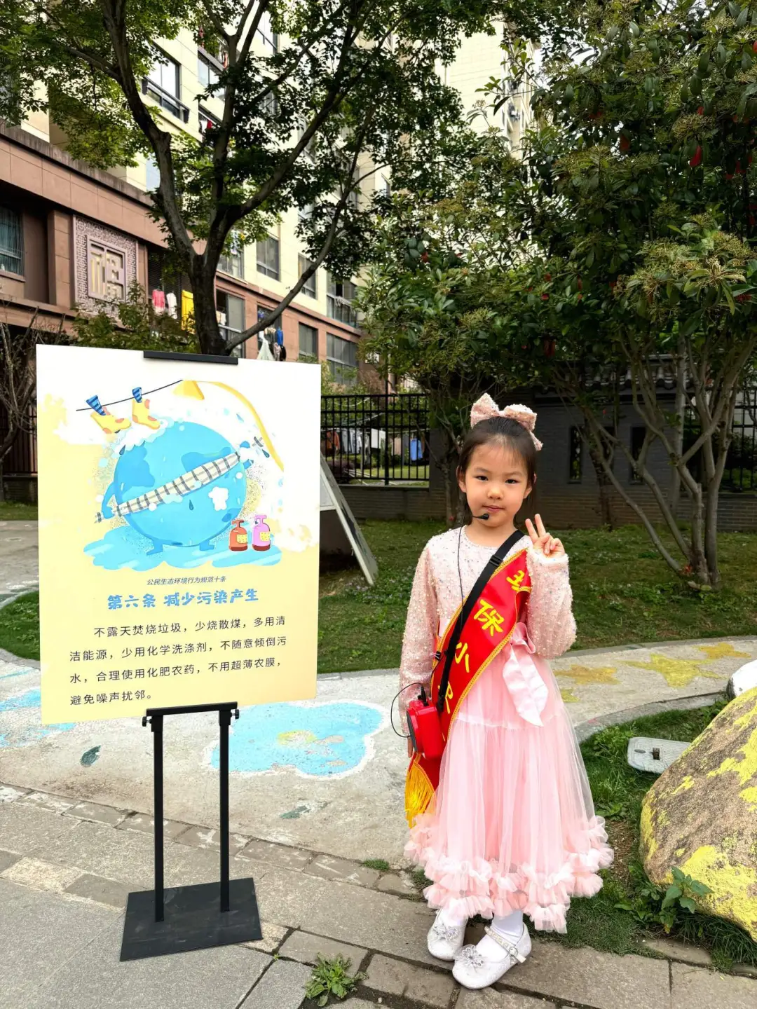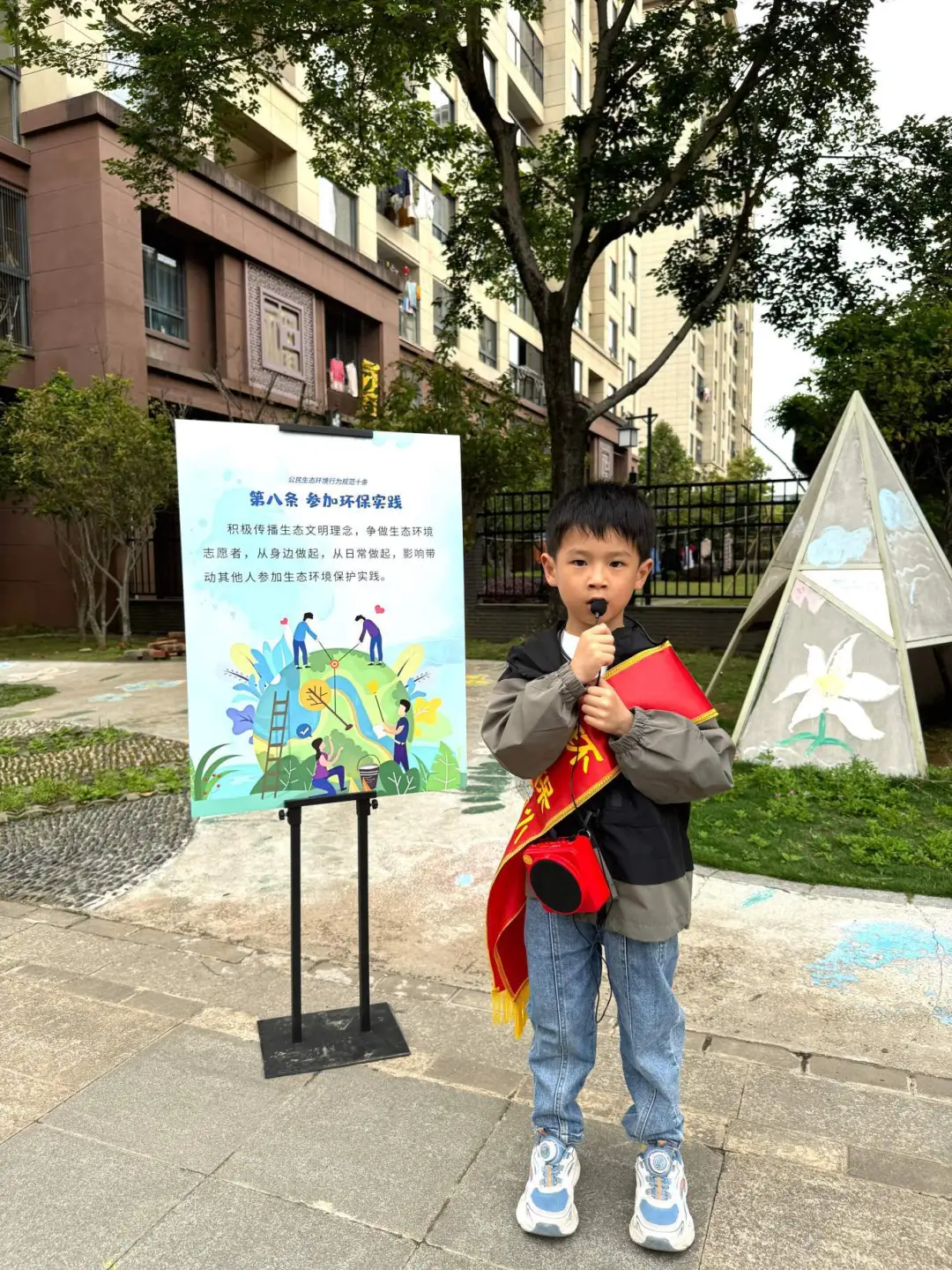 早晨入园时,一群身披“环保小卫士”绶带的孩子向过往的家长和幼儿们讲解《公民生态环境行为规范十条》主题展板的内容。听着孩子们稚嫩的童声,家长们不约而同露出会心微笑,不少孩子围拢过来,跟着复述“不乱扔垃圾”“节约用水”的环保口号。