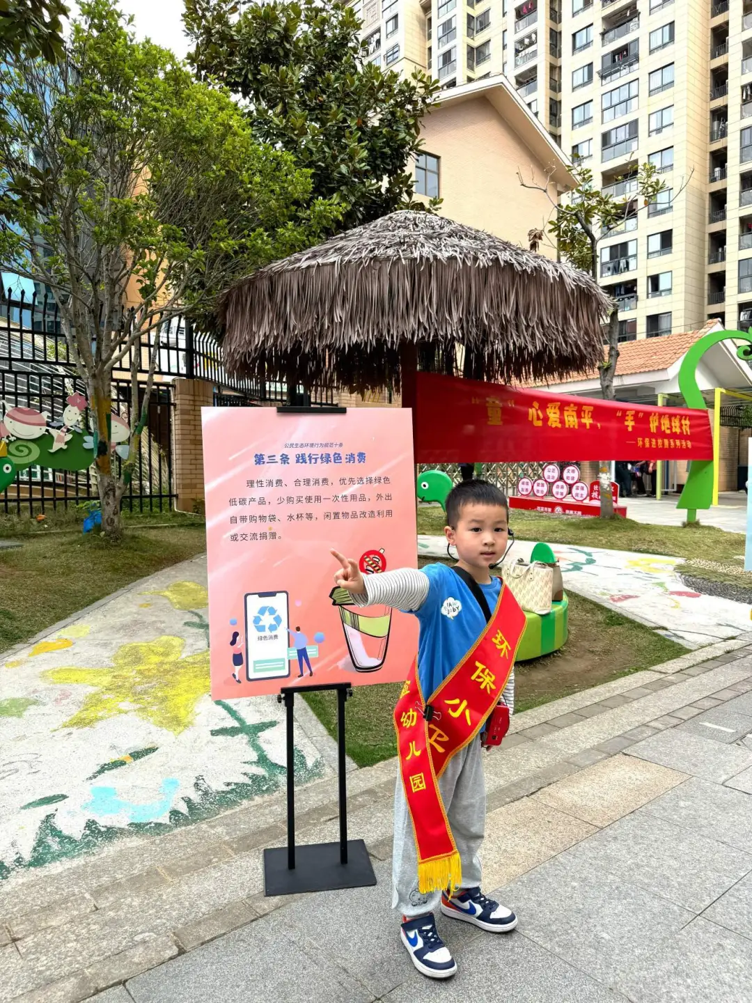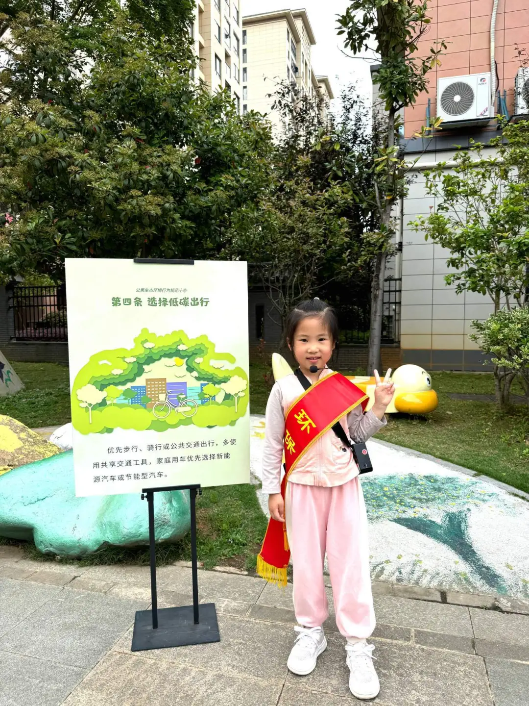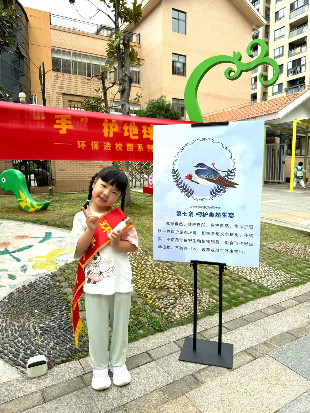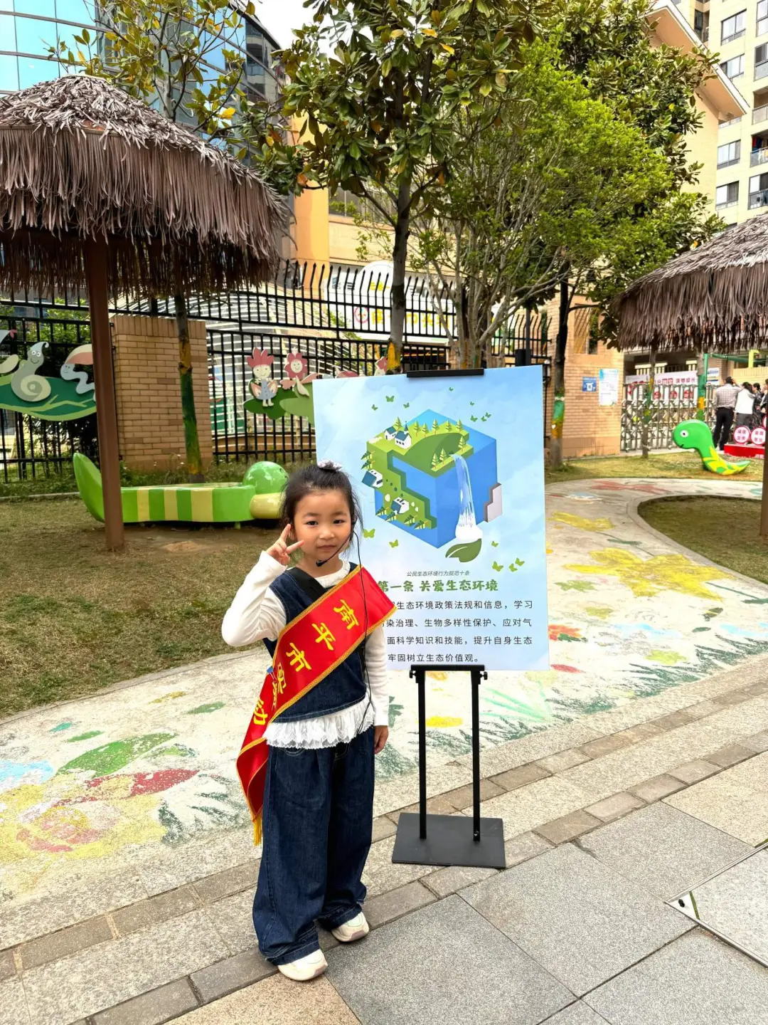 早晨入园时,一群身披“环保小卫士”绶带的孩子向过往的家长和幼儿们讲解《公民生态环境行为规范十条》主题展板的内容。听着孩子们稚嫩的童声,家长们不约而同露出会心微笑,不少孩子围拢过来,跟着复述“不乱扔垃圾”“节约用水”的环保口号。