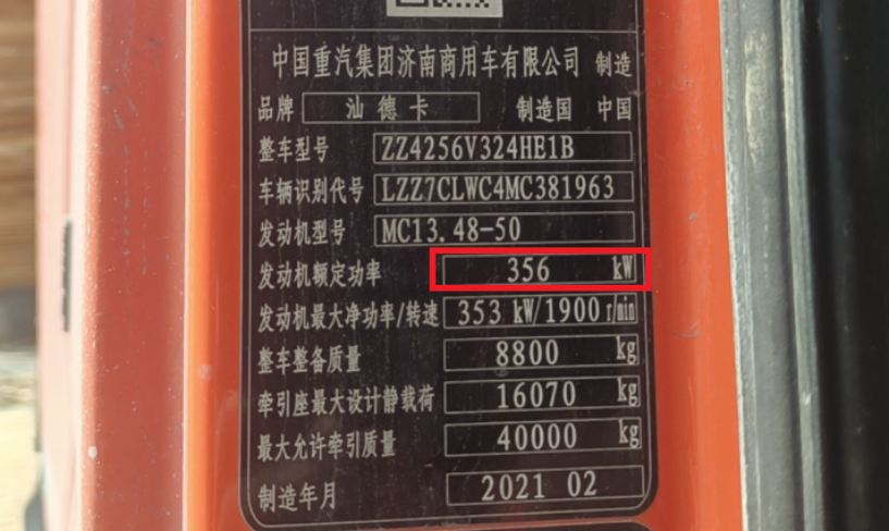 闽e8**19车辆铭牌额定功率为356kw