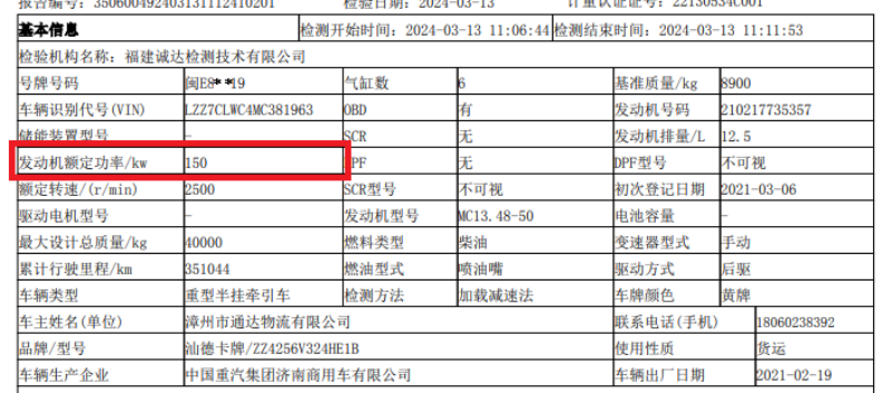闽e8**19车辆检测时登记的额定功率为150kw