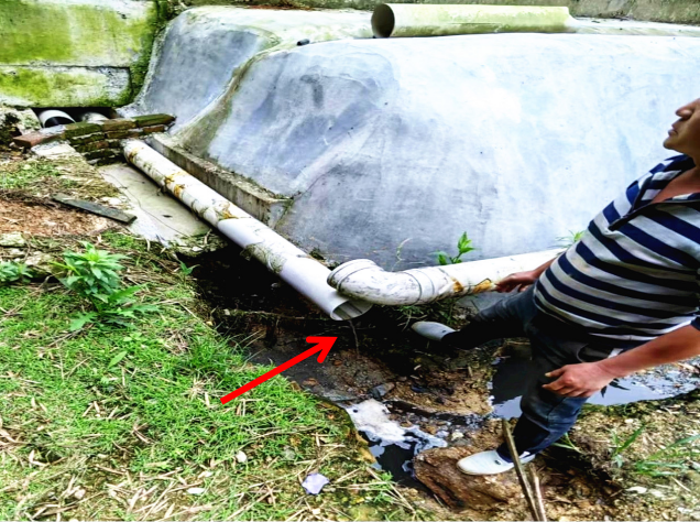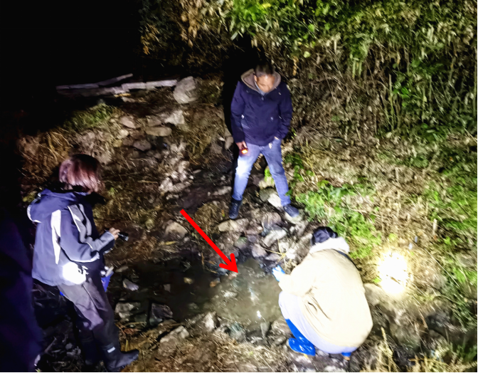 监测人员对该合作社消纳地尾端外排养殖废水现场采样