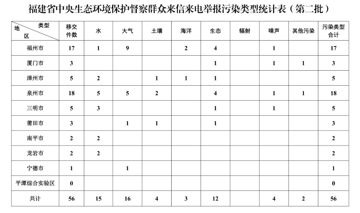 中央第一生态环境保护督察组向福建省转办第二批群众信访举报件56件